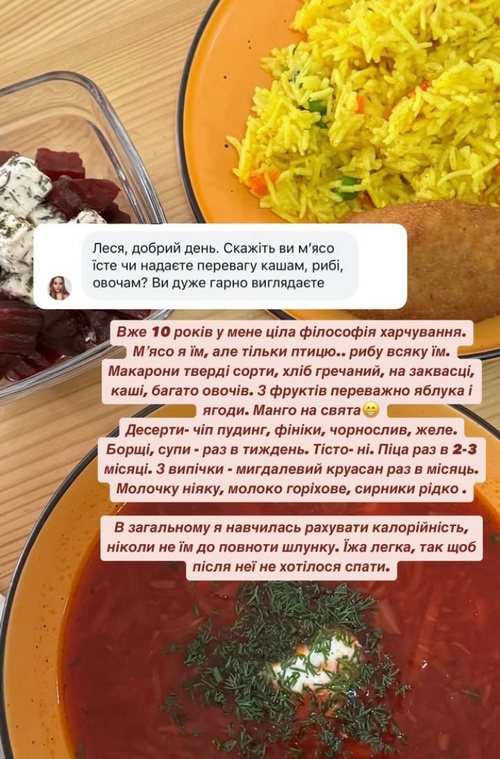 «Вже десять років у мене ціла філософія харчування, — написала Леся. - Мʼясо я їм, але тільки птицю… рибу всяку їм. Макарони твердих сортів, хліб гречаний на заквасці, каші, багато овочів.