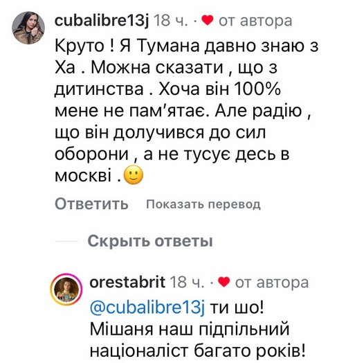 «Круто! — написали у коментарях. — Я „Тумана“ давно знаю з Ха. Можна сказати, що з дитинства… Радію, що він долучився до Сил оборони, а не тусує десь у москві».