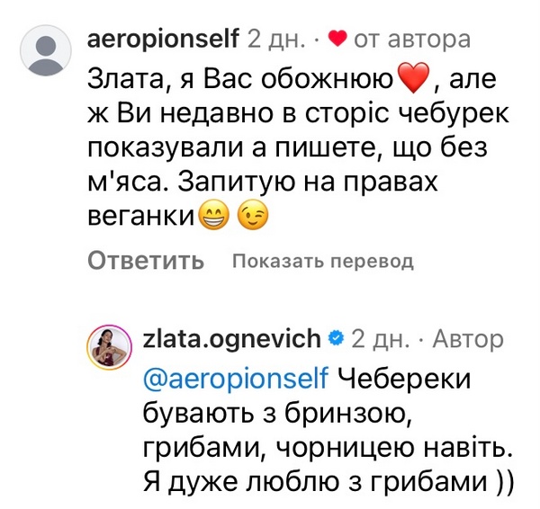 «Злата, я Вас обожнюю, але ж Ви недавно в сторіс чебурек показували, а пишете, що без м'яса, — зауважили у коментарях. — Запитую на правах веганки».