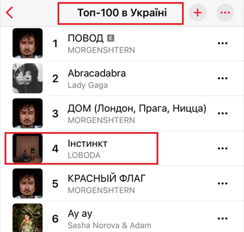 Лише через чотири дні після виходу нового україномовного танцювального треку співачки LOBODA «Інстинкт» ця пісня посіла четверте місце у Top 100: Ukraine на стрімінговому сервісі Apple Music.ВІДЕО ДНЯ