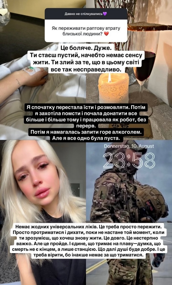 «Це треба просто пережити, — написала дівчина. — Просто протриматися і дихати, поки не настане той момент, коли ти зрозумієш, що знову хочеш жити. Це довго. Це нестерпно важко. Але це пройде. І єдине, що тримає на плаву, — думка, що смерть не є кінцем, а лише станцією. Що далі душі буде добре. І в це треба вірити, бо інакше немає за що триматися».