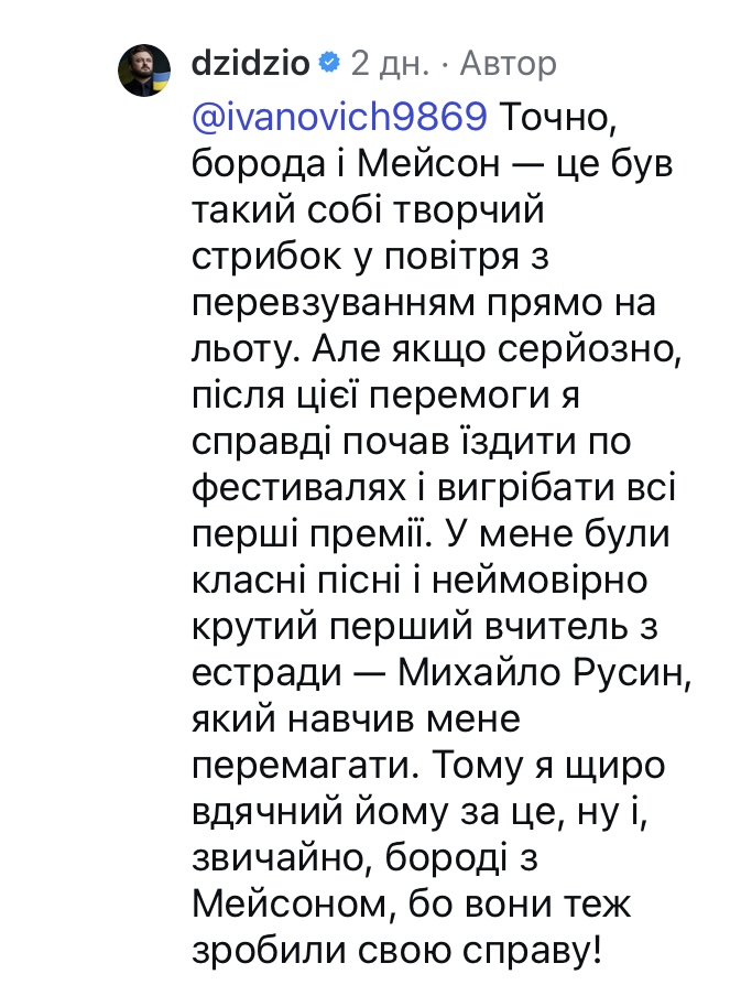 «Я справді почав їздити по фестивалях і вигрібати всі перші премії, — згадав Михайло. - У мене були класні пісні й неймовірно крутий перший вчитель з естради — Михайло Русин, який навчив мене перемагати. Тому я щиро вдячний йому за це, ну і, звичайно, бороді з Мейсоном, бо вони теж зробили свою справу!»