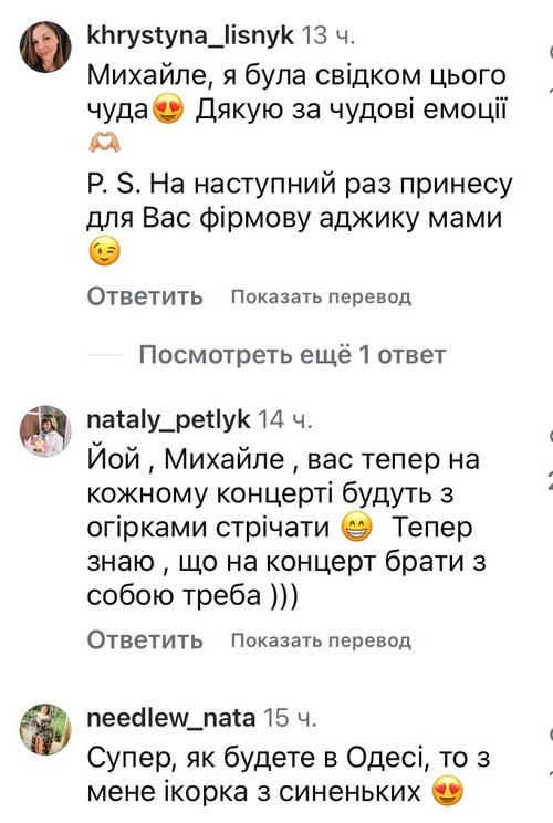 «Йой, Михайле, вас тепер на кожному концерті будуть з огірками зустрічати, — додали у коментарях. — Тепер знаю, що на концерт брати з собою треба»