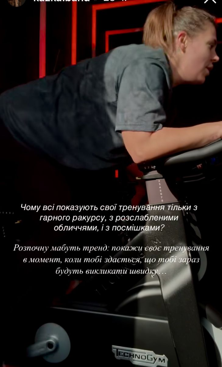 — Чому всі показують свої тренування тільки з гарного ракурсу, з розслабленими обличчями та з посмішками? — звернулася вона до мережі. — Розпочну, мабуть, тренд: покажи своє тренування в момент, коли тобі здається, що зараз будуть викликати «швидку».