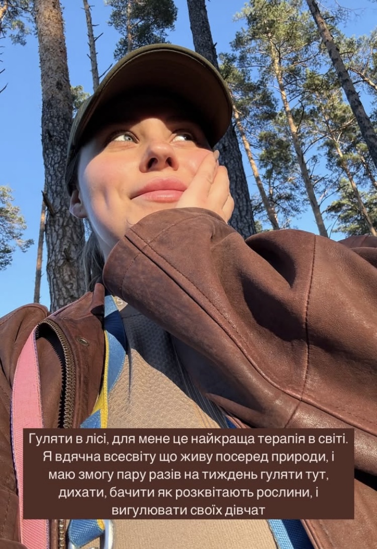 — Гуляти в лісі для мене — це найкраща терапія у світі, — написала співачка, виклавши фото серед дерев. — Я вдячна всесвіту, що живу посеред природи і маю змогу пару разів на тиждень гуляти тут, дихати, бачити, як розквітають рослини, і вигулювати своїх дівчат.