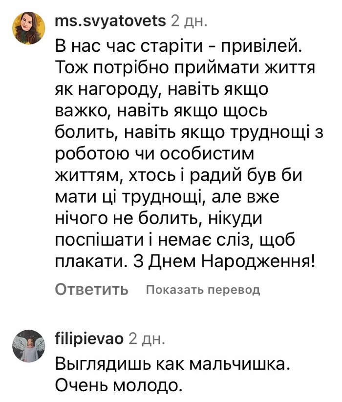 «У наш час старіти — привілей, — поділилися думками. — Тож потрібно приймати життя як нагороду, навіть якщо важко, навіть якщо щось болить, навіть якщо труднощі з роботою чи особистим життям, хтось і радий був би мати ці труднощі, але вже нічого не болить, нікуди поспішати і немає сліз, щоб плакати».