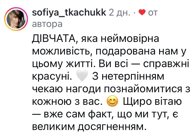 «Дівчата, яка неймовірна можливість подарована нам у цьому житті, — написала одна з півфіналісток. — Ви всі — справжні красуні. З нетерпінням чекаю нагоди познайомитися з кожною з вас. Щиро вітаю — вже сам факт, що ми тут, є великим досягненням».РЕКЛАМА