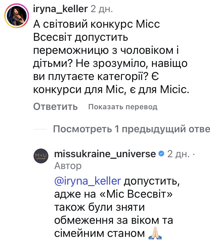 «А світовий конкурс „Міс Всесвіт“ допустить переможницю з чоловіком і дітьми? — здивувалися у коментарях. - Не зрозуміло, навіщо ви плутаєте категорії? Є конкурси для Міс, є для Місіс».