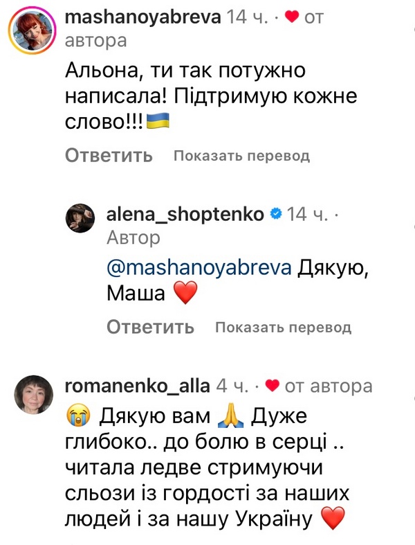 «Дуже глибоко… до болю в серці… читала, ледве стримуючи сльози із гордості за наших людей і за нашу Україну», — подякували Олені за допис.