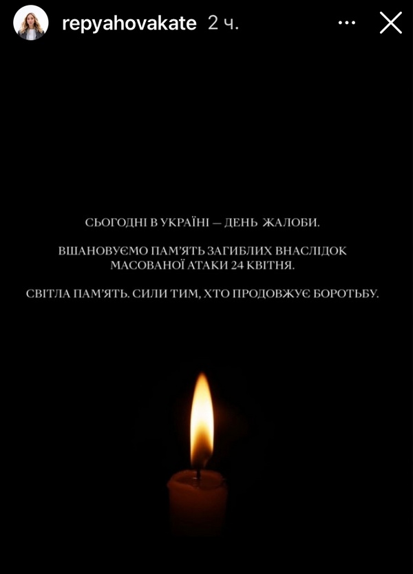 Українські зірки та культурні установи скасовують заплановані премʼєри та вистави через День жалоби за загиблими внаслідок масштабної ракетної атаки росіян. Нагадаємо, в ніч на 24 квітня ворожа ракета поцілила у житловий будинок у Києві та вбила дванадцять його мешканців.ВІДЕО ДНЯ