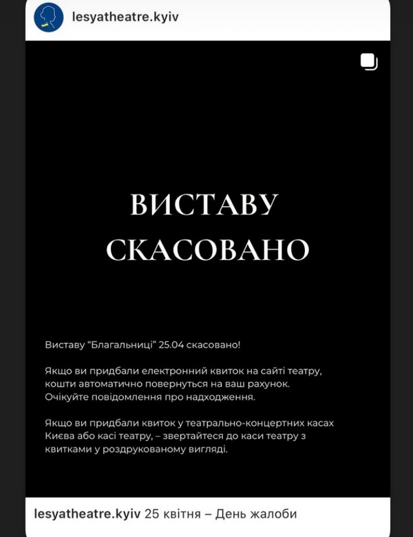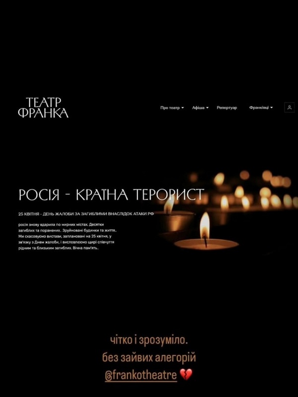 «росія — країна терорист», — написав на своїй сторінці Театр імені Івана Франка та скасував вистави 25-го квітня.РЕКЛАМА