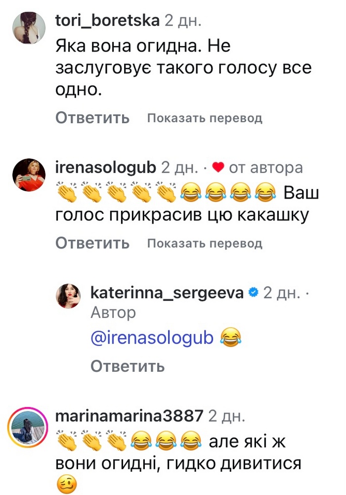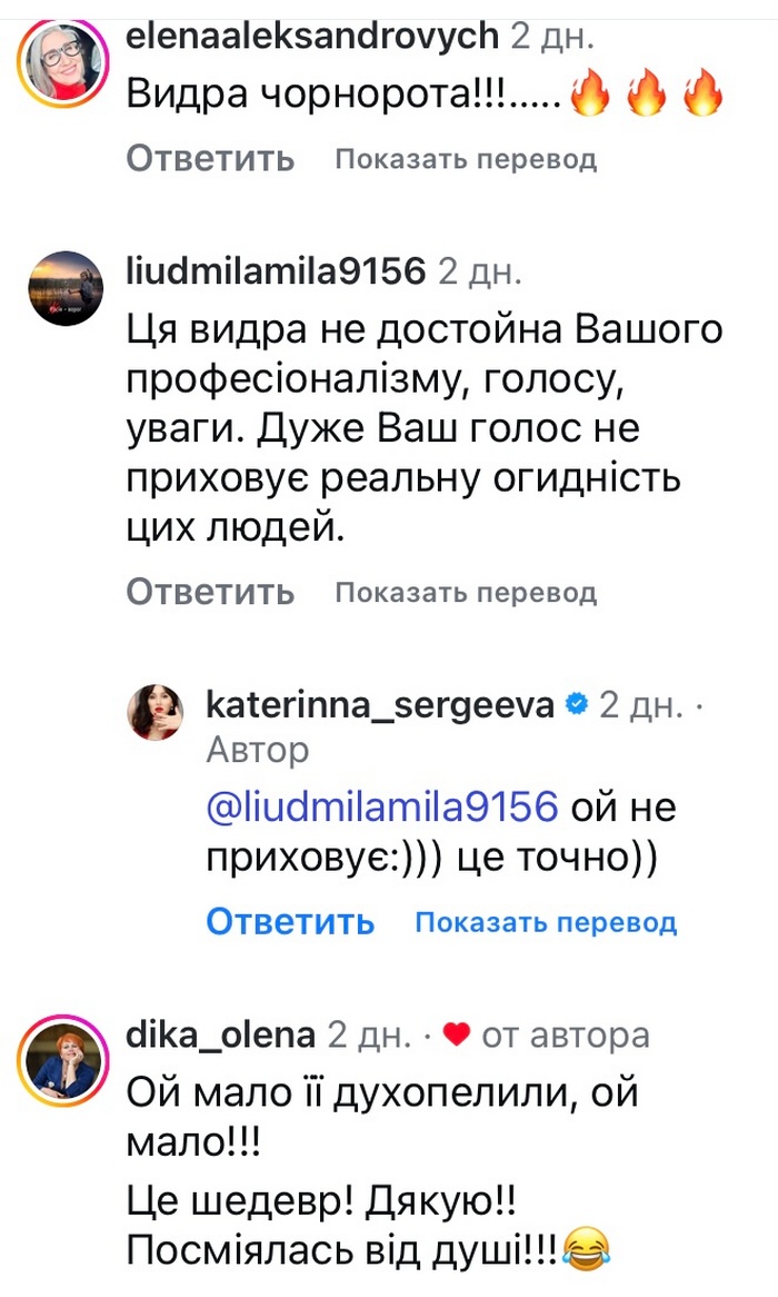 Підписники подякували Катерині за пародію та зауважили, що її голос занадто красивий для ворогів.РЕКЛАМА