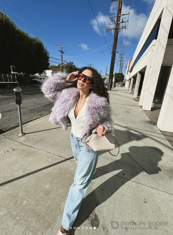 Свою коротку світло-бузкову шубу вона доповнила блакитними широкими джинсах та кросівками.