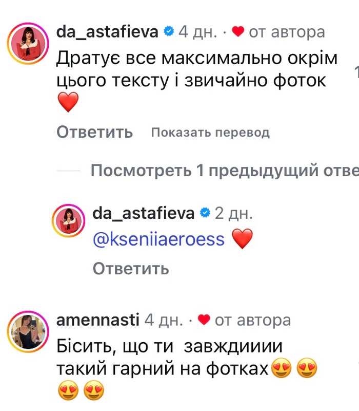 «Дратує все максимально, окрім цього тексту і, звичайно, фоток», — написала Даша Астафьєва.