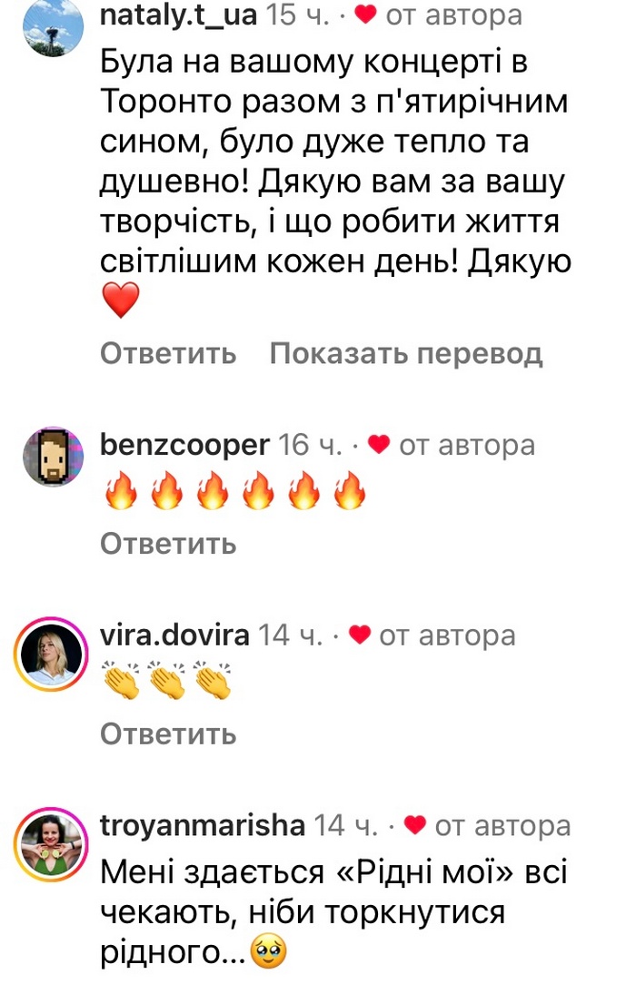 «Була на вашому концерті в Торонто разом з п'ятирічним сином, було дуже тепло та душевно! — поділилися враженнями. — Дякую вам за вашу творчість і що робите життя світлішим кожен день!«