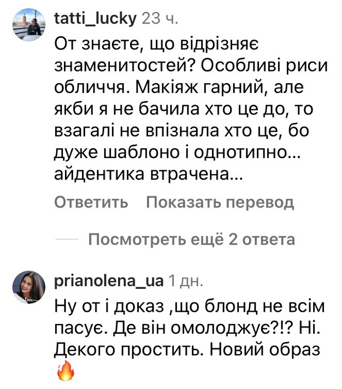 «От знаєте, що відрізняє знаменитостей? — поділилися думками. — Особливі риси обличчя. Макіяж гарний, але якби я не бачила, хто це до, то взагалі б не впізнала, хто це, бо дуже шаблонно й однотипно… айдентика втрачена».РЕКЛАМА