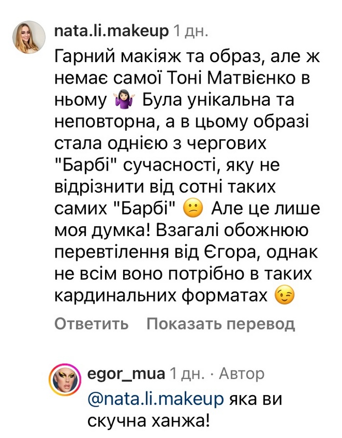 «Гарний макіяж та образ, але ж немає самої Тоні Матвієнко в ньому, — написали під світлинами. — Була унікальна та неповторна, а в цьому образі стала однією з чергових „Барбі“ сучасності, яку не відрізнити від сотні таких самих „Барбі“. Але це лише моя думка! Взагалі обожнюю перевтілення від Єгора, однак не всім воно потрібно в таких кардинальних форматах».РЕКЛАМА