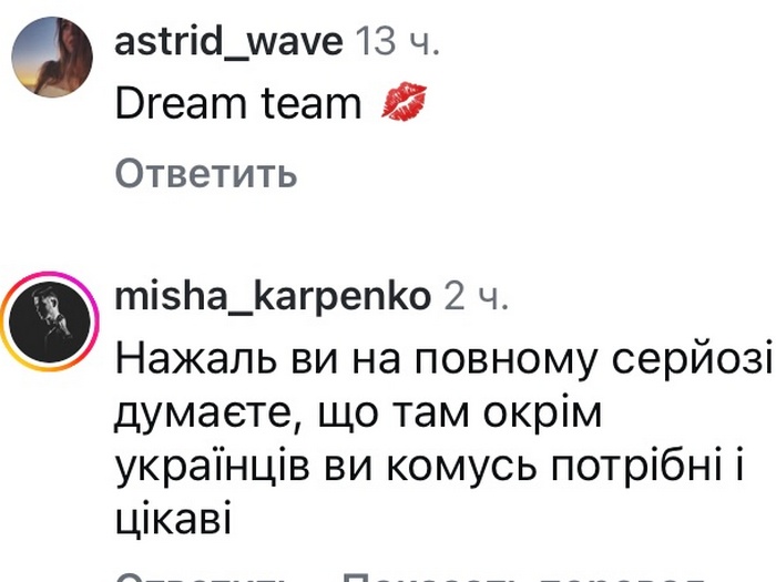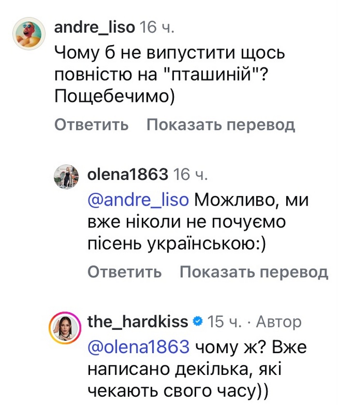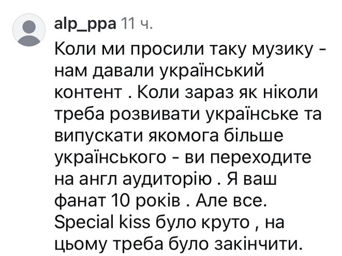 «Коли ми просили таку музику — нам давали український контент, — зауважили шанувальники. — Коли зараз, як ніколи, треба розвивати українське та випускати якомога більше українського — ви переходите на англ аудиторію. Я ваш фанат 10 років. Але все. Special kiss було круто, на цьому треба було закінчити».