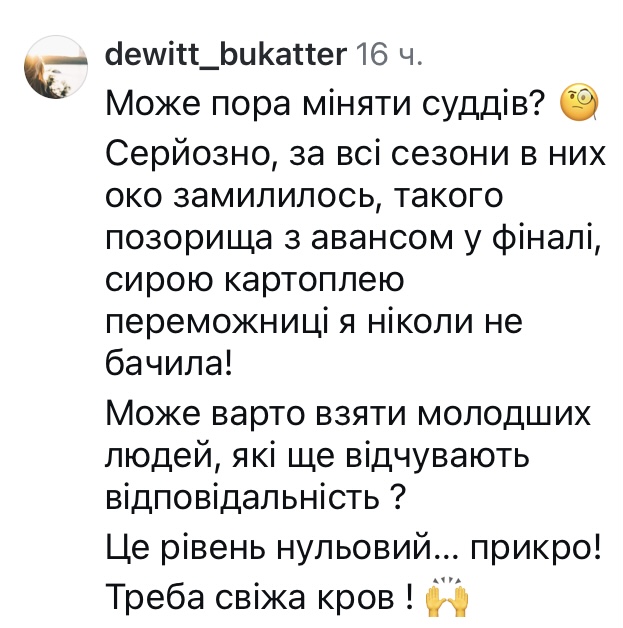«Може, пора міняти суддів? — задаються питанням у коментарях. — Серйозно, за всі сезони в них око замилилось, такого позорища з авансом у фіналі, сирою картоплею переможниці я ніколи не бачила! Може, варто взяти молодших людей, які ще відчувають відповідальність? Треба свіжа кров!»