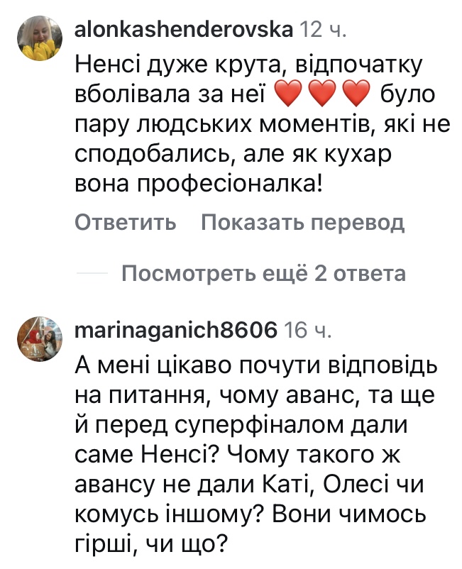 «Ненсі дуже крута, від початку вболівала за неї, — написали у коментарях. — Було пару людських моментів, які не сподобались, але як кухар вона професіоналка!»РЕКЛАМА