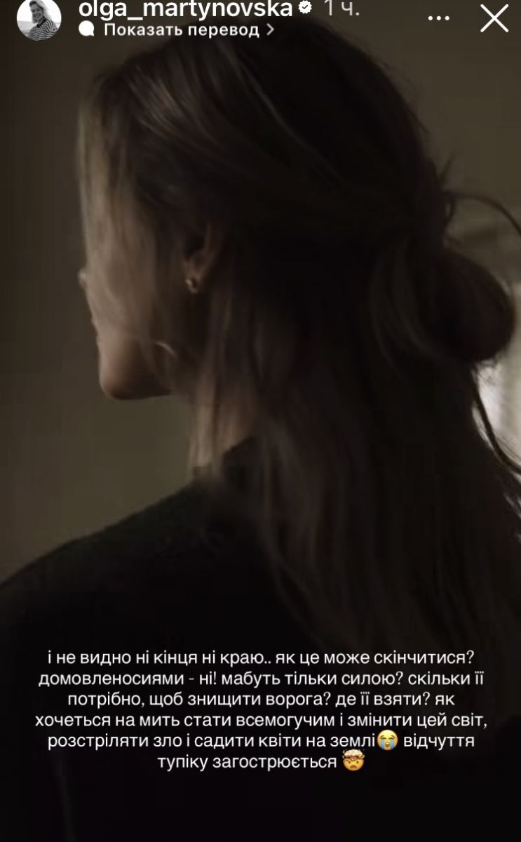— Жодної відповіді, — написала Ольга. - Встала (бо, слава Богу, встала), пішла. І не видно ні кінця ні краю… Як це може скінчитися? Домовленостями — ні! Мабуть, тільки силою? Скільки її потрібно, щоб знищити ворога? Як хочеться на мить стати всемогучим і змінити цей світ, розстріляти зло і садити квіти на землі. Відчуття тупику загострюється.