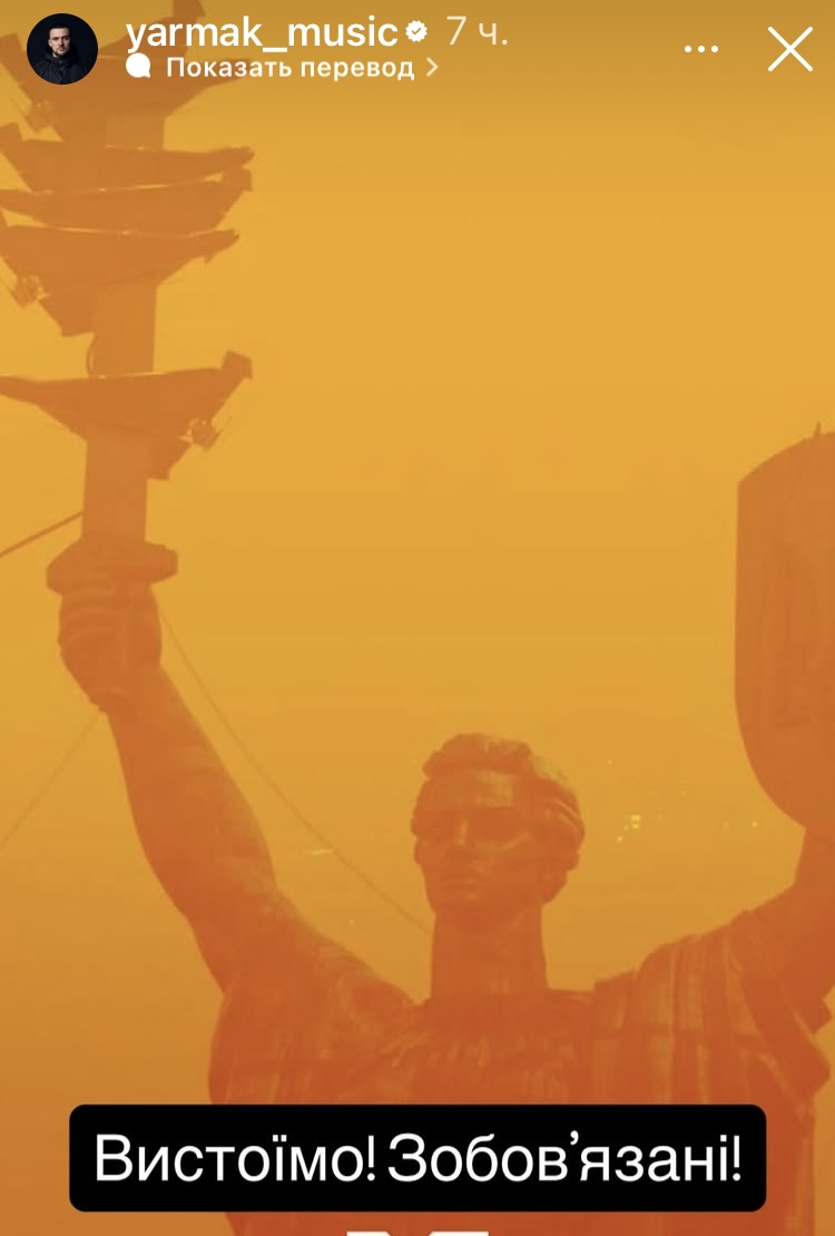 Репер та військовий Ярмак на своїй сторінці виклав світлину Батьківщини-матері з нанизаними на меч дронами.