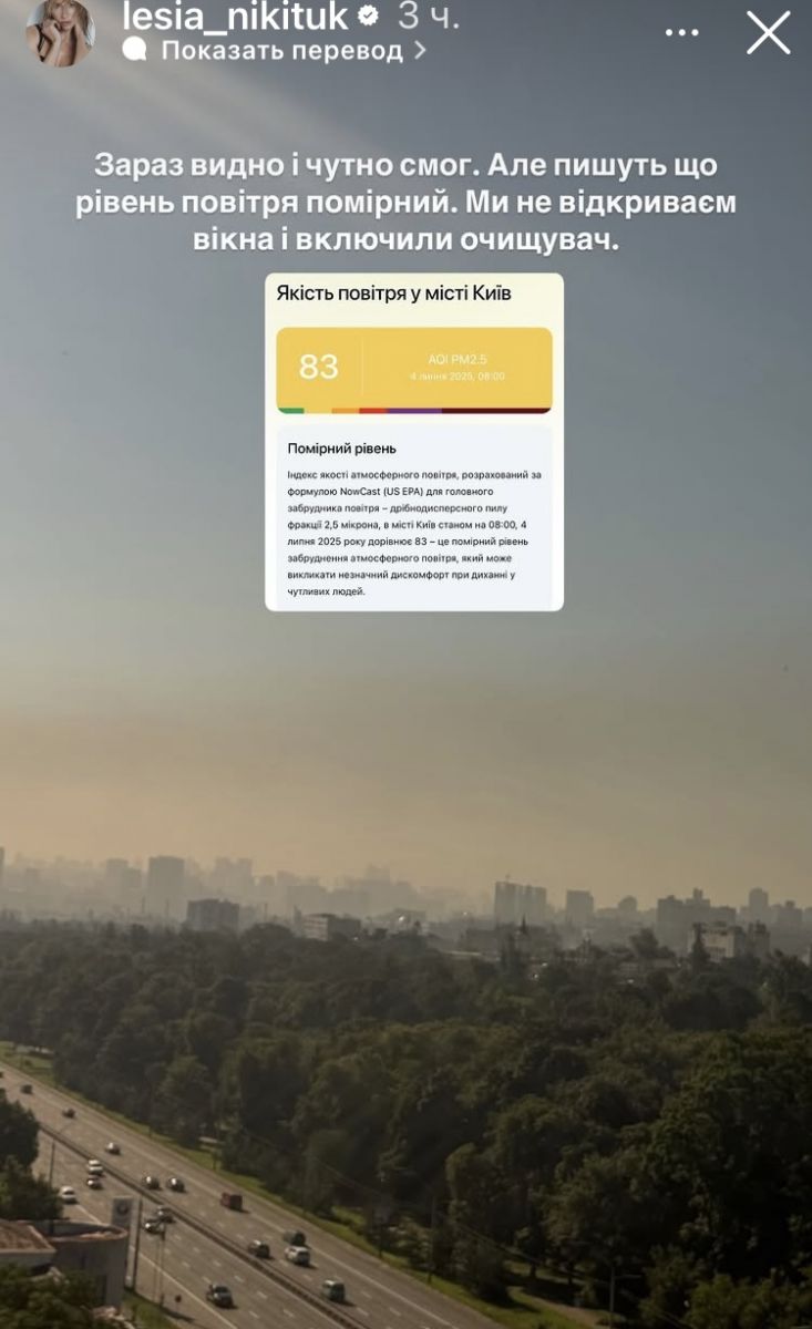 — Страшна ніч, — написала Леся. — Ранкове чорне небо після обстрілів. Київ. Зараз видно і чутно смог. Ми не відкривали вікна і включили очищувач.