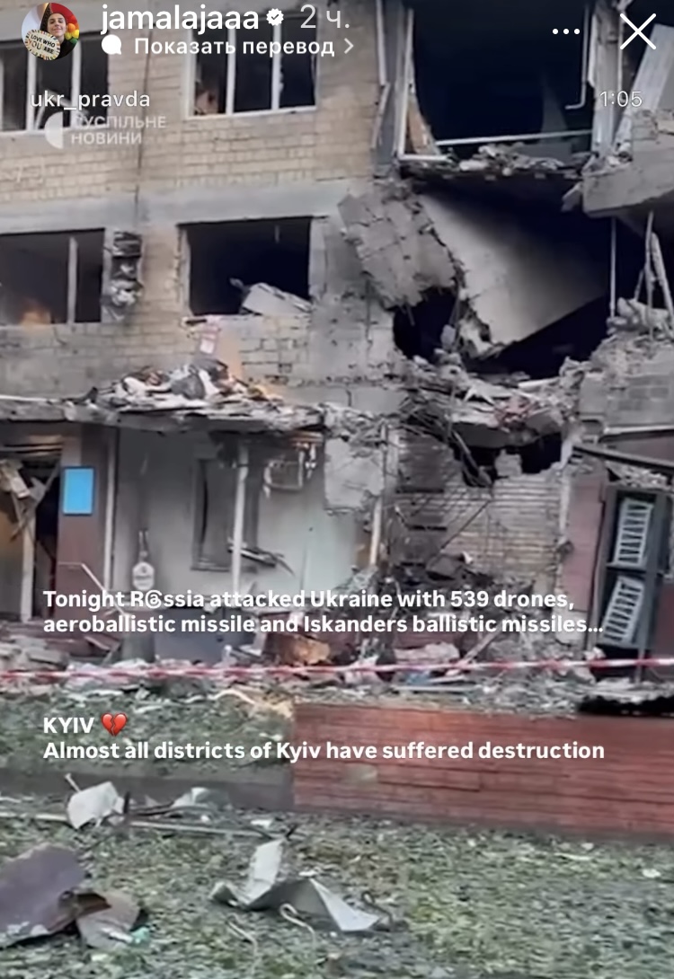 Співачка Джамала звернулася до своєї аудиторії англійською та повідомила про наслідки ракетно-дронової атаки.