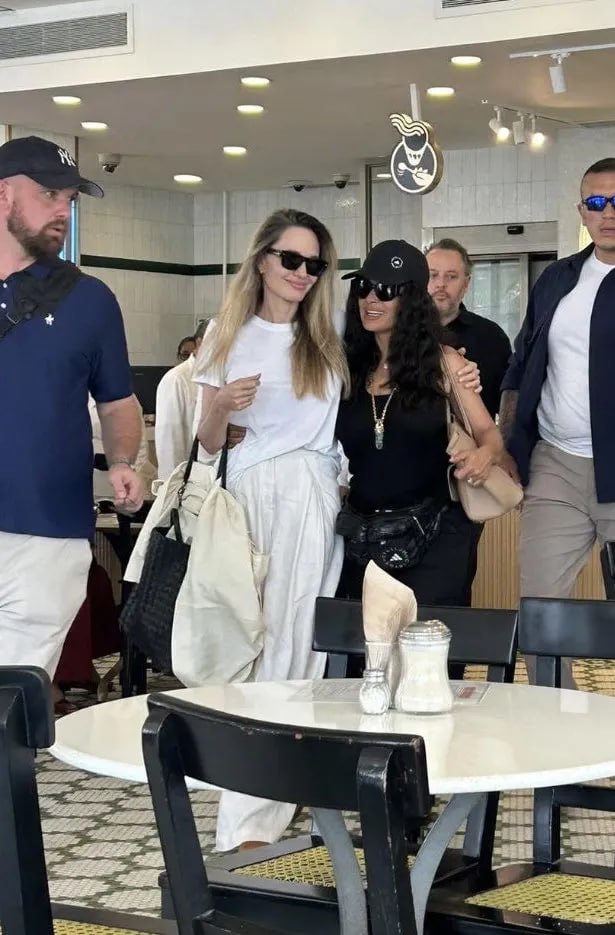 На «посиденькі» у кав'ярні 50-річна Анджеліна Джолі одягла білі штани та футболку, а 58-річна Сальма Хайєк обрала образ total black. Обидві актриси доповнили свої луки сонцезахисними окулярами.РЕКЛАМА