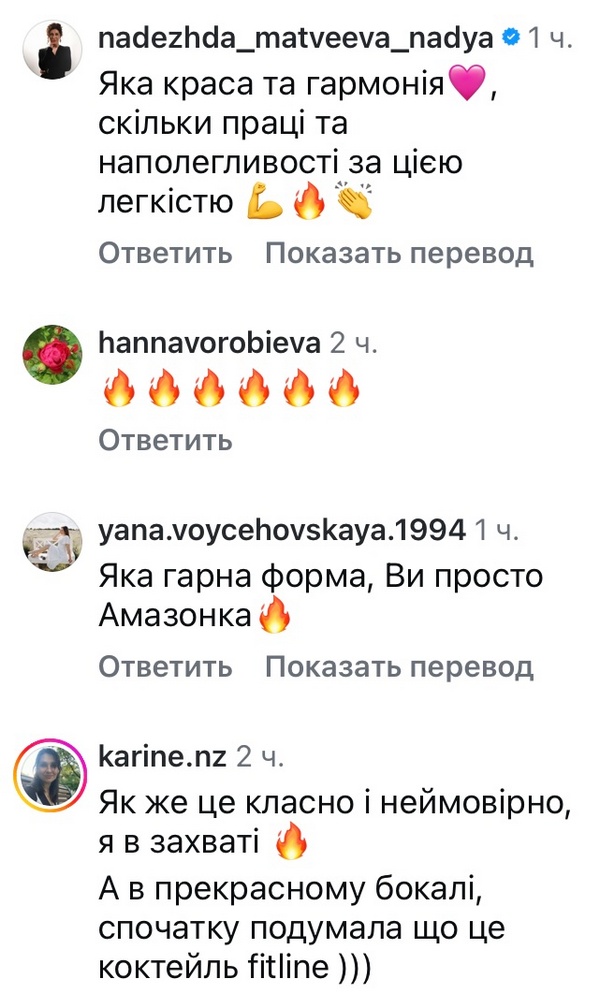 «Яка краса та гармонія, скільки праці та наполегливості за цією легкістю», — написала ведуча Надія Матвєєва.