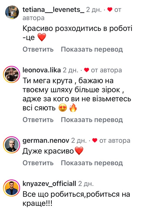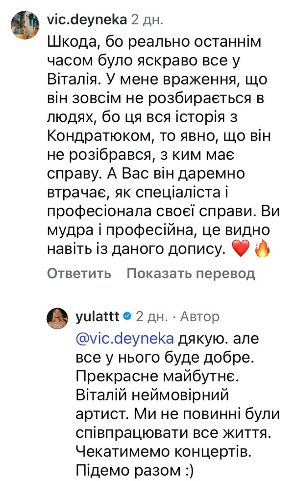 «Все у нього буде добре, — відповіла піарниця на коментар щодо позиції Віталія. — Прекрасне майбутнє. Віталій неймовірний артист. Ми не повинні були співпрацювати все життя. Чекатимемо концертів. Підемо разом:)»