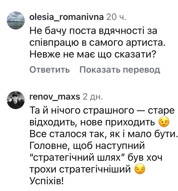 «Не бачу поста вдячності за співпрацю в самого артиста, — здивувалися підписники. — Невже немає, що сказати?»