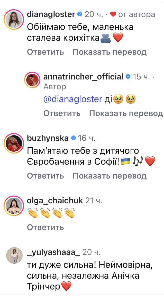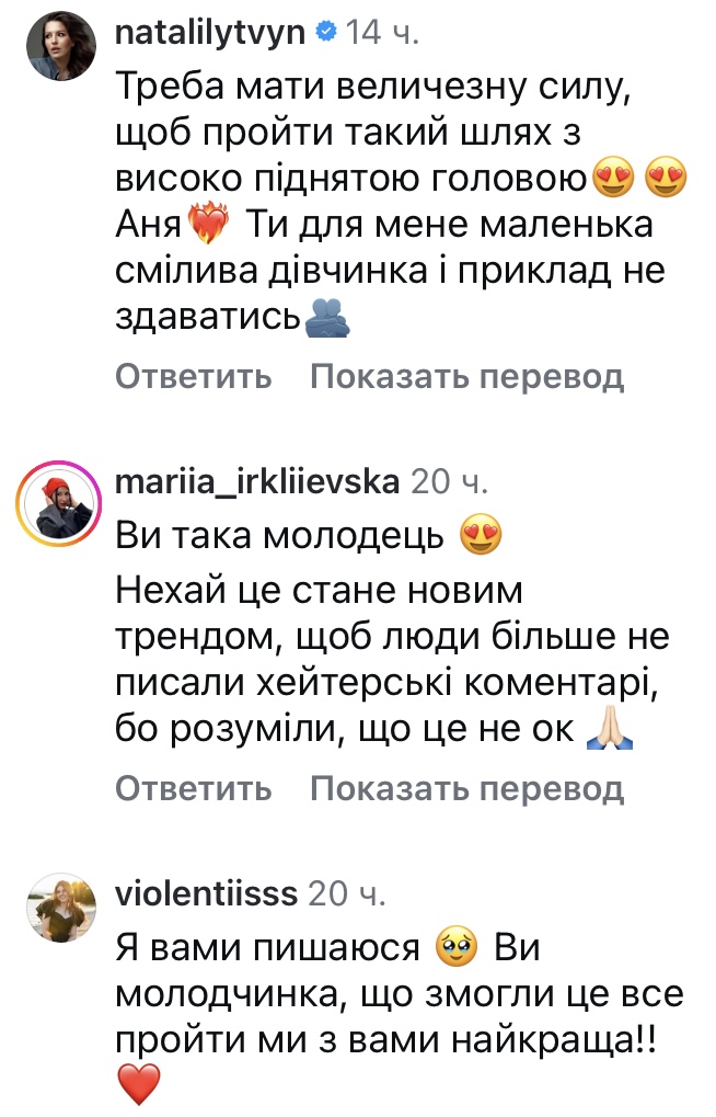 З тих пір я пройшла різні етапи «прийняття» цієї сторони публічності. Але категорично не хочу з нею миритися. Саме тому я показую вам обличчя тих, хто залишає такі коментарі. Можливо, десь «крига зсунеться» і люди почнуть усвідомлювати відповідальність за свої слова.