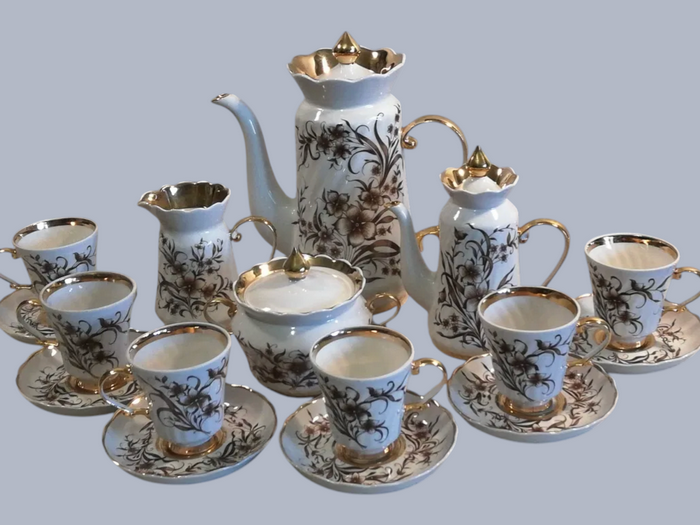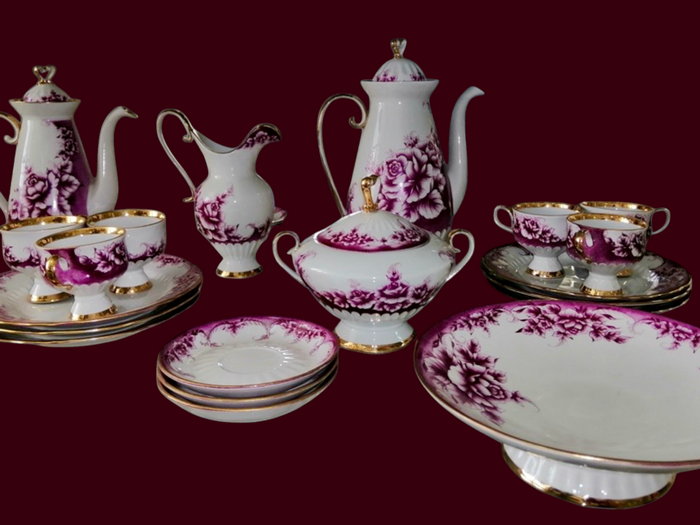 Сервіз «Ольга» — вишуканий приклад українського порцелянового мистецтва 1980-х, що поєднує стриману класику та емоційно насичений розпис. Форма, розроблена Миколою Трегубовим, вражає пропорційністю й елегантністю. Кавник має високу, струнку форму з плавно вигнутим носиком і декоративно підкресленою ручкою. Декор Наталії Галушко-Аксьоненко —водночас яскравий та ніжний. Глибокі відтінки пурпурово-малинового та винного кольору надають композиції особливої виразності. Урочистості додає щедре золочення: облямівка, ручки, кришки та ніжки кожного предмета блищать теплим золотом, що підкреслює монументальність сервізу та його святковий характер. Це справжній парадний ансамбль для особливих моментів. Якщо б сервіз міг говорити, він би сказав: «Я створений, щоб робити ваші дні теплішими, святковішими й красивішими!»