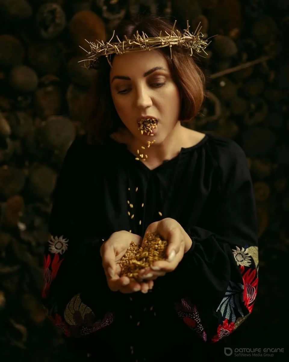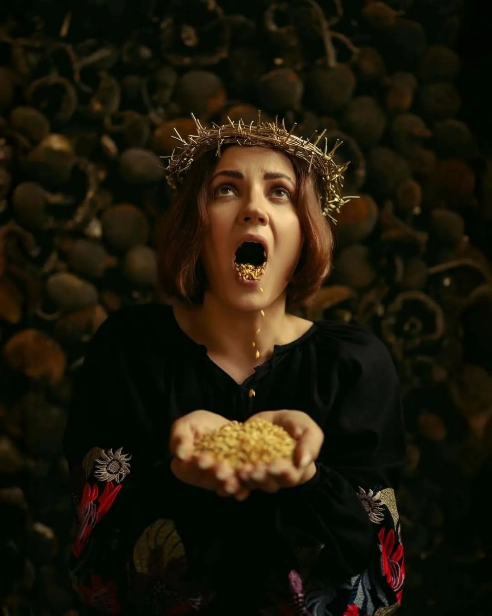 Багато фоловерів не зрозуміли задуму і назвали світлини моторошними. На фото Цибульська — в чорній сорочці з вишивкою, з розпущеним волоссям і терновим вінком, тримаючи в руках і в роті пшеницю.
