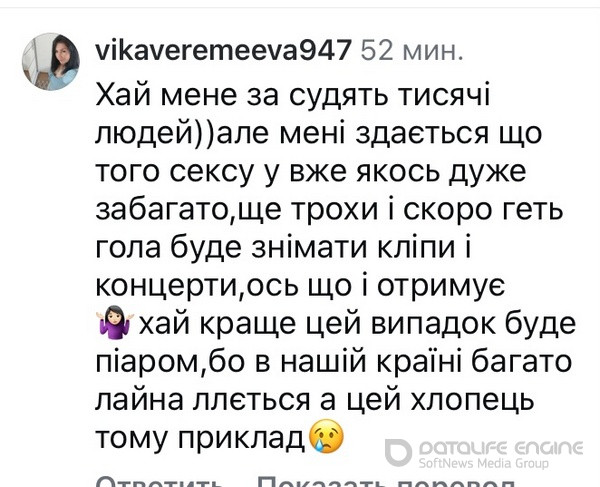 «Хай мене засудять тисячі людей)) але мені здається, що того сексу вже якось дуже забагато, ще трохи і скоро геть гола буде знімати кліпи і концерти, ось що і отримує, — поділилися враженням. — Хай краще цей випадок буде піаром, бо в нашій країні багато лайна ллється, а цей хлопець тому приклад».РЕКЛАМА
