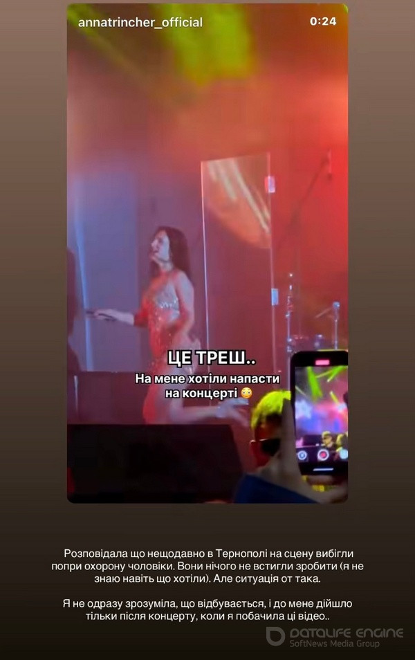 Популярна співачка Анна Трінчер, яка нещодавно випустила провокативний кліп, шокувала відео зі свого концерту. Під час виступу у Тернополі на сцену до артистки намагалися вибігти двоє чоловіків. Охорона зуміла вчасно їх зупинити, налякавши Трінчер.ВІДЕО ДНЯ