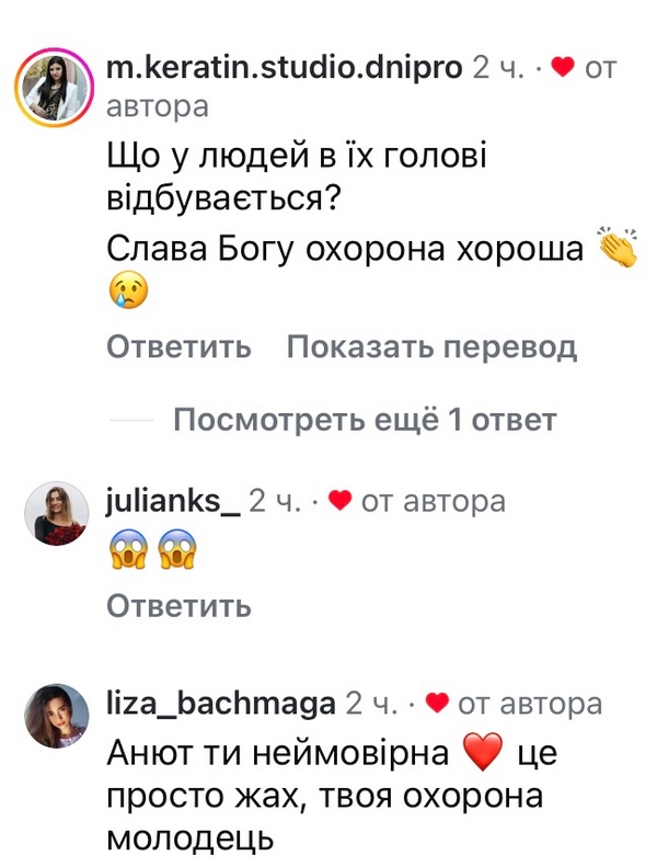 «Я дуже злякалась, якщо чесно… Що в голові у цих людей? — поділилася думками Анна. — Дуже дякую охороні за секундну реакцію».