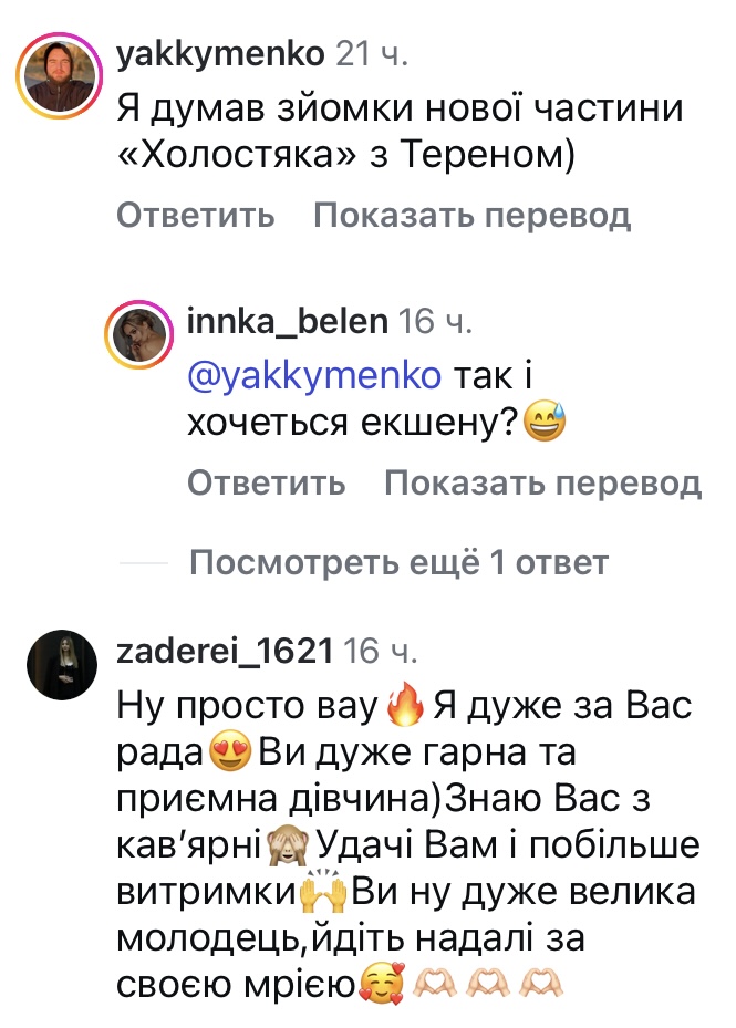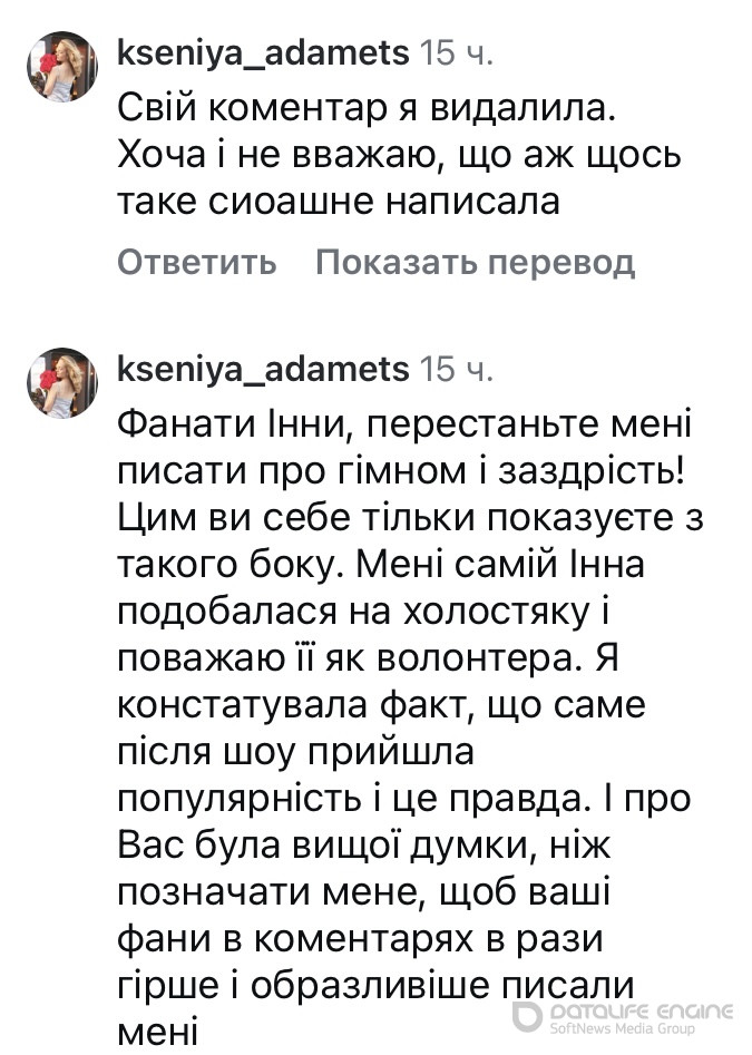 «Фанати Інни, перестаньте мені писати, — попросила одна з коментаторок, яка зауважила, що саме „Холостяк“ зробив дівчину популярною. - Цим ви себе тільки показуєте з такого боку. Мені самій Інна подобалася на „Холостяку“ і поважаю її як волонтера. Я констатувала факт, що саме після шоу прийшла популярність, і це правда. І про Вас була вищої думки, ніж позначати мене, щоб ваші фани в коментарях в рази гірше і образливіше писали мені».