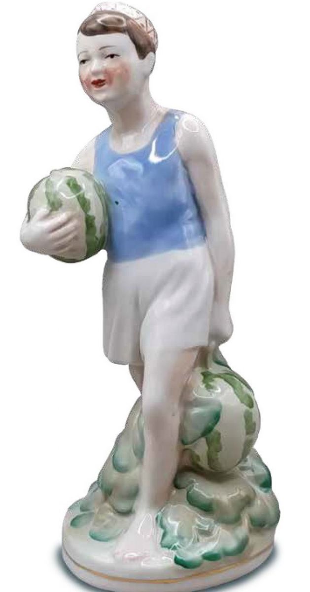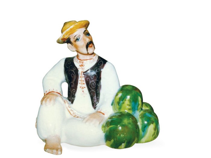 — А ось підліток з кавунами — ця робота створена на Городницькому фарфоровому заводі у 1950 роки. У блакитній майці та білих шортах, він стоїть упевнено, тримаючи один кавун у руках, а другий бачимо біля його ніг. Обличчя підлітка з легкою усмішкою та теплим рум’янцем передає відчуття задоволення від щедрого врожаю.РЕКЛАМА