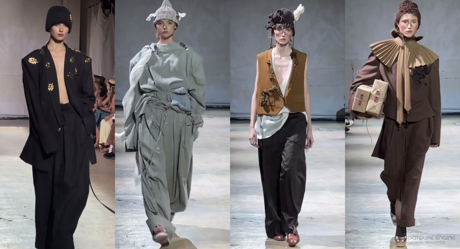 Моделі дефілювали у мішкуватих нарядах, багато оздоблених всілякими брошками, ремінцями, поясами, у дивних шапках та з сумками, сплетеними з товстих ниток.