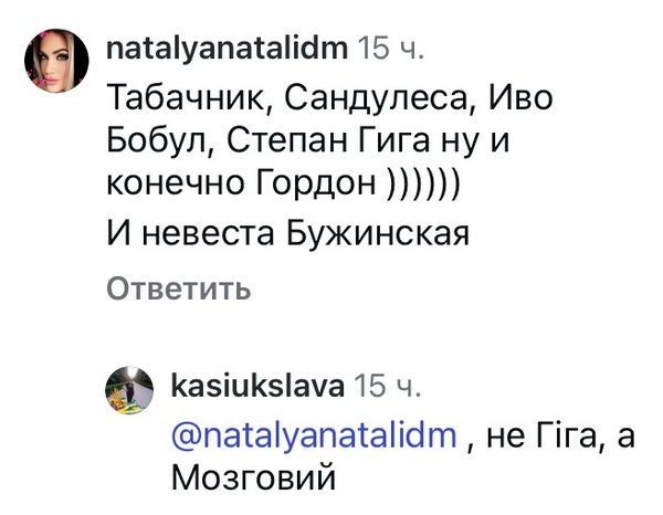 «Табачник, Сандулеса, Иво Бобул, Степан Гига, ну, и конечно, Гордон), — написали у відповідь. — И невеста Бужинская».