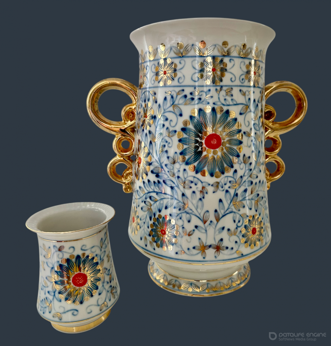 — Велика ваза постає як урочистий центр усього ансамблю. Її форма підкреслює монументальність, а витончені розкішні ручки, вигнуті у химерні завитки та вкриті густим золотом, надають їй вишуканості. Декор повторює характерний для серії мотив: мереживо тонких синіх стебел із дрібним листям, що в’ються по білосніжному фарфору, утворюючи розлогі рослинні гілки. Серед цього орнаментального шитва пульсують червоно-золоті розетки — сонячні серця квітів, розкриті у сяйві синіх пелюсток. Легкі золоті крапки й штрихи створюють ефект мерехтіння, немов на поверхні порцеляни грає світло. Мініатюрна вазочка поруч, витончено розширена донизу, немов елегантне відлуння головного акценту.