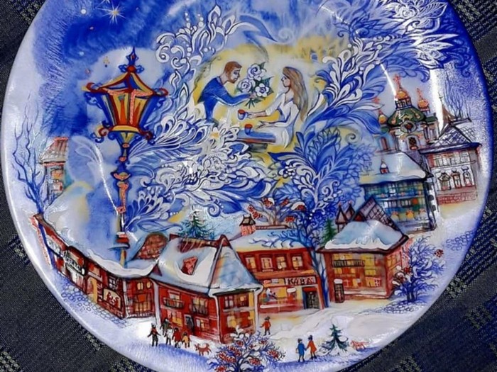 - Напередодні Різдва. У цей час Київ стає справді казковим. На фото одна із різдвяних тарілок. Якось випав сніг, такий пухкий та чистий, і кафешки так привітно й гостинно світили своїми вогниками. Я гуляла Андріївським узвозом, і в моїй уяві з'явився розпис…