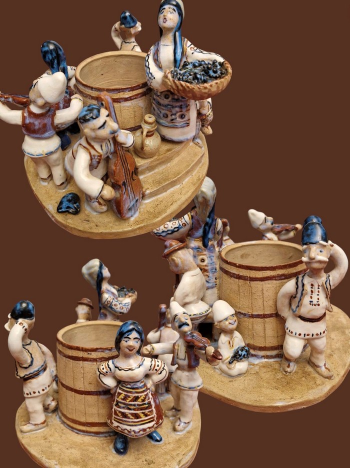 - А от ще одна робота на тему збору винограду. Композиція «Свято урожаю» — справжня керамічна вистава, де кожна фігурка оживає у ритмі веселого ярмарку та виноградного свята. Навколо діжок зібралися музиканти й танцюристи, господарі та гості. Декор — легкий, з акцентом на теплій охристій гамі й синіх та червоних деталях, що нагадують народний розпис. Музика скрипки, кобзи й баса ніби лунає крізь глину й поливу, а діжки для вина стають центром цього театру життя. «Свято Урожаю» Галини Кломбицької — не лише декоративна група, а й символ дійства, де праця перетворюється на свято. Це твір, у якому оживає український народний характер: з гумором, музикою, танцем і духом єдності. Керамічна група — немов народна вистава, де кожен персонаж — актор на сцені життя.РЕКЛАМА