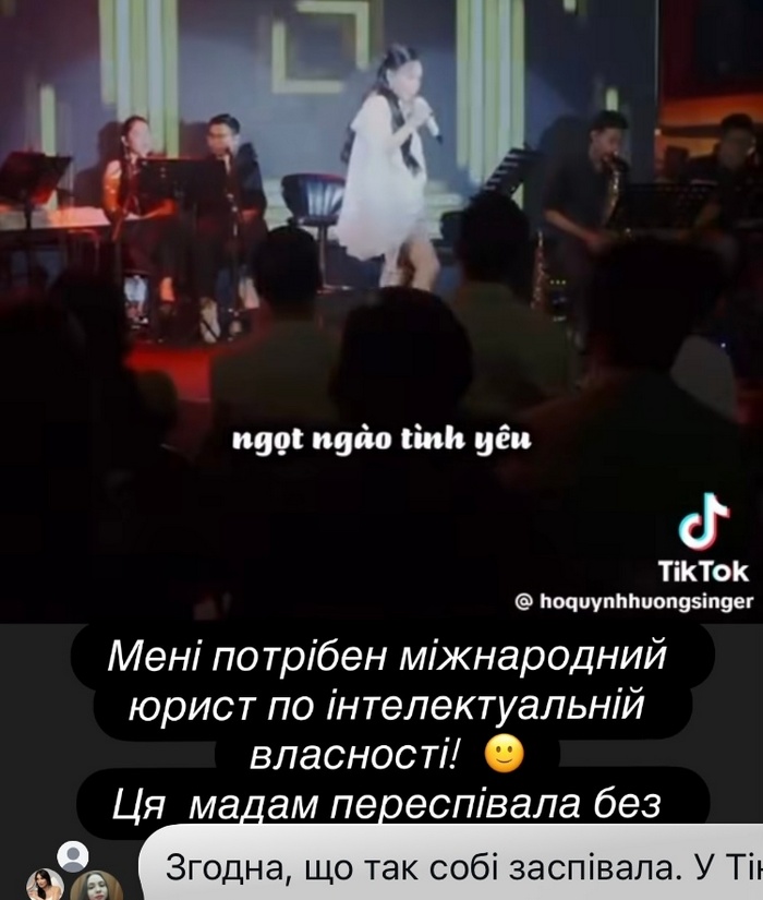 «Мені потрібен міжнародний юрист по інтелектуальній власності, — підписала відео з виступом співачки Тіна. — Ця мадам переспівала без дозволу купу пісень».