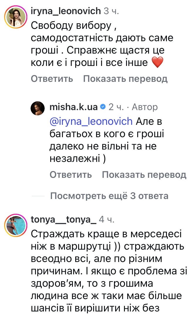 «Свободу вибору, самодостатність дають саме гроші, — написали у коментарях. — Справжнє щастя — це коли є і гроші, й все інше».
