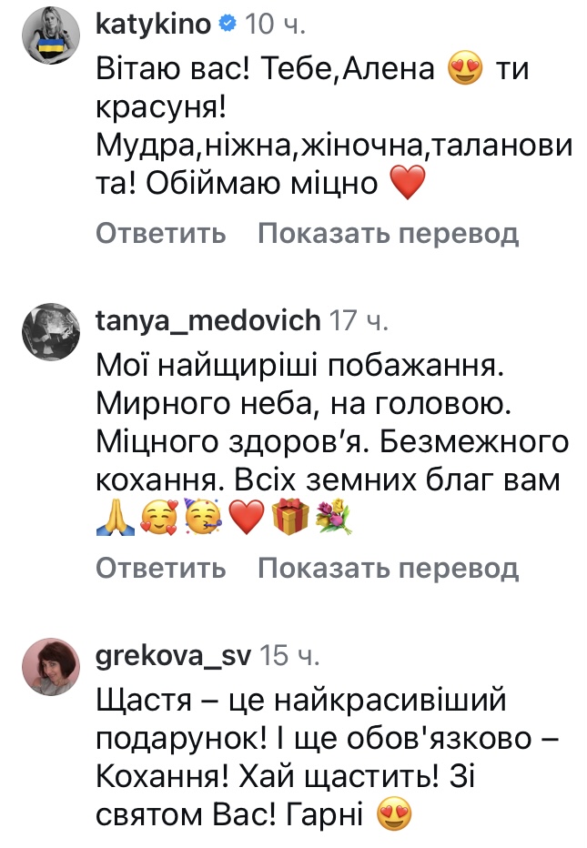 «Вітаю вас! — написали у мережі. — Тебе, Алена, ти красуня! Мудра, ніжна, жіночна, талановита! Обіймаю міцно».