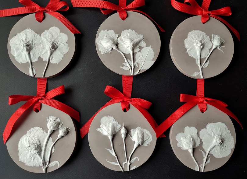 — Принцип створення дифузорів такий, як і ботанічних картин-барельєфів. Все починається з глини — я розкачую її, як тісто для домашньої випічки. Намічаю формат майбутньої роботи, розкладаю рослини згідно зі своїм задумом і притискаю їх. Потім рослини видаляються, а сліди від них залишаються в глині. Далі роблю опалубку (тимчасову конструкцію) з тієї ж глини чи дерев’яних планок і заливаю гіпс. І через годину маю застиглу гіпсову плиту, що зберігає рельєф рослин.