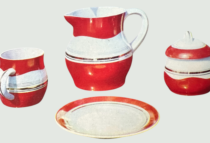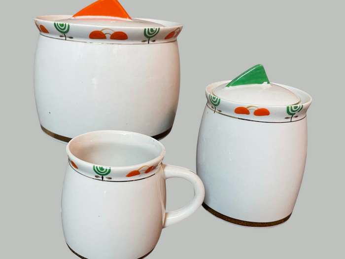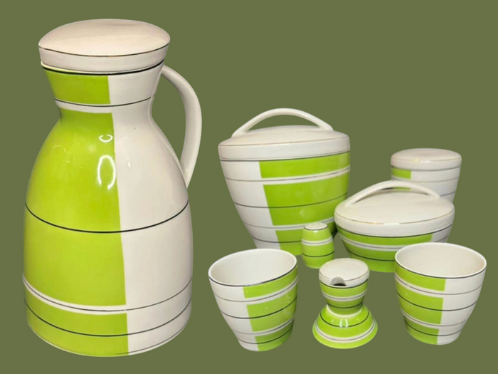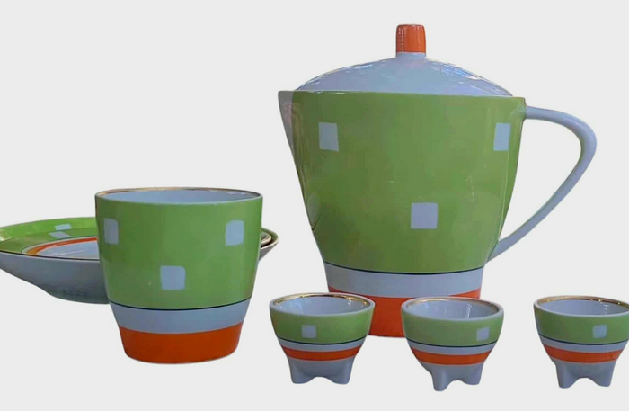 - А от ще одна робота Миколи Старченка. Цей набір —приклад того, як у 1960-х український дизайн поєднував конструктивну чіткість із м’яким відчуттям побутової теплоти. Форми — округлі, зручні для руки. Простота силуету підкреслена тонким декоративним ритмом: по вінцю проходить орнамент із стилізованими квітами — лаконічними, але життєрадісними, у зелених і помаранчевих тонах.